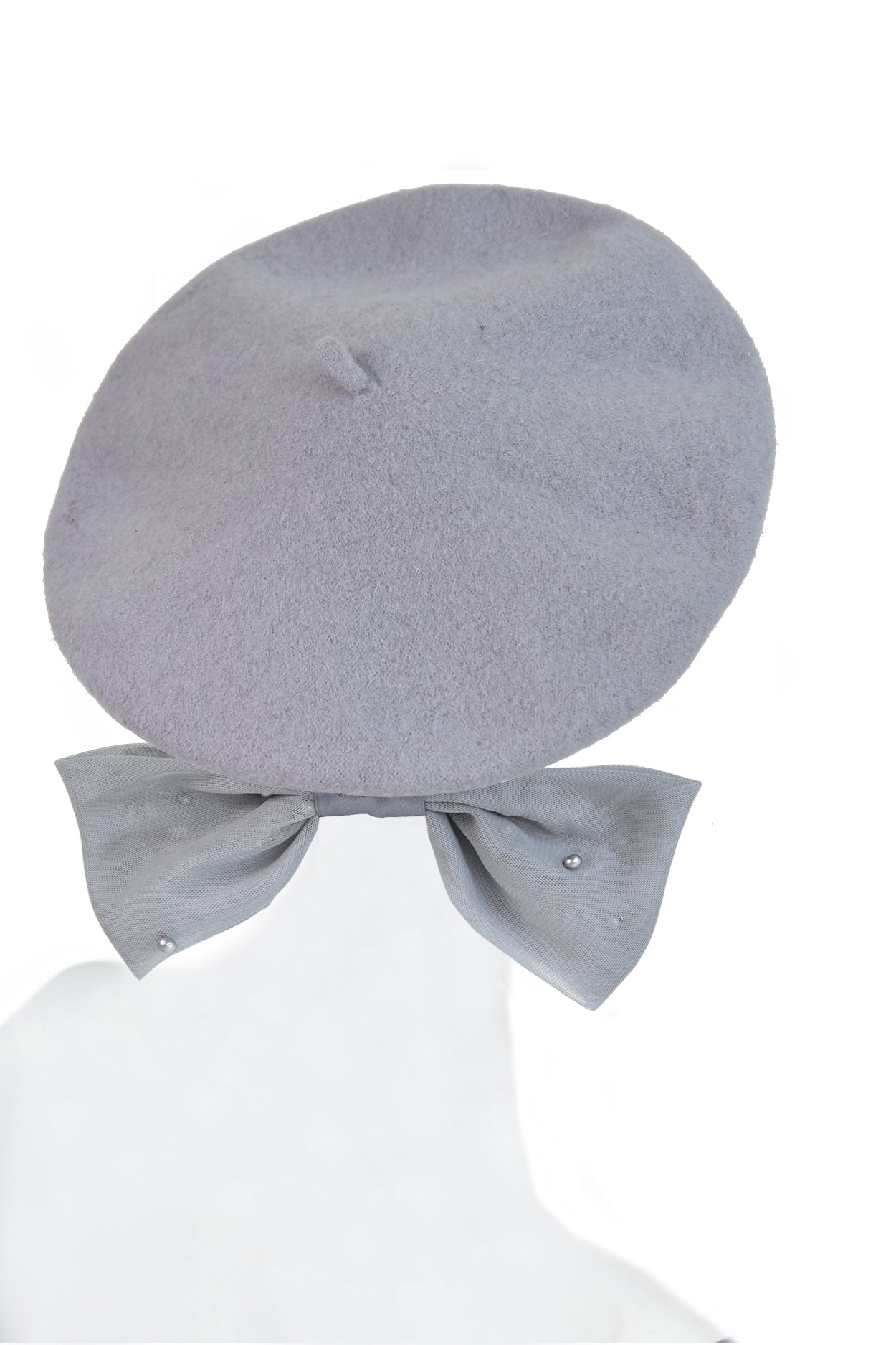 The standout feature is the delicate handmade tulle bow sewn at the back, beautifully adorned with shimmering pearls and finished with a satin band. This feminine detail adds a graceful touch to the serene blue-gray hue, making the beret perfect for both casual and formal styles.