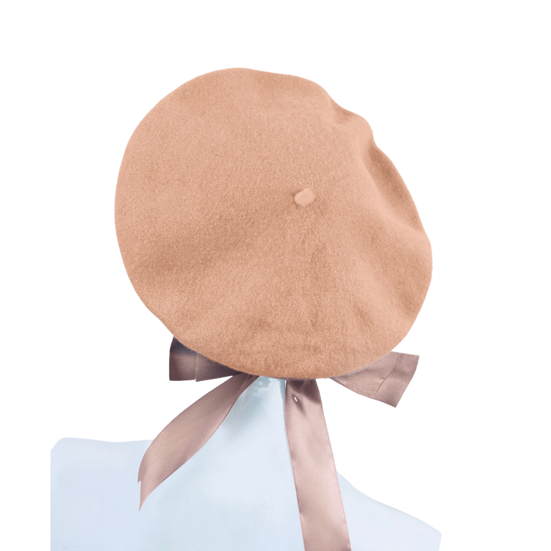Beret rose saumon avec ruban à l’arrière, fait à la main, showcasing quality craftsmanship and timeless style. Featuring the soft elegance of the Vieux rose ribbon, this beret is perfect for anyone looking to add a delicate yet sophisticated accessory to their wardrobe.