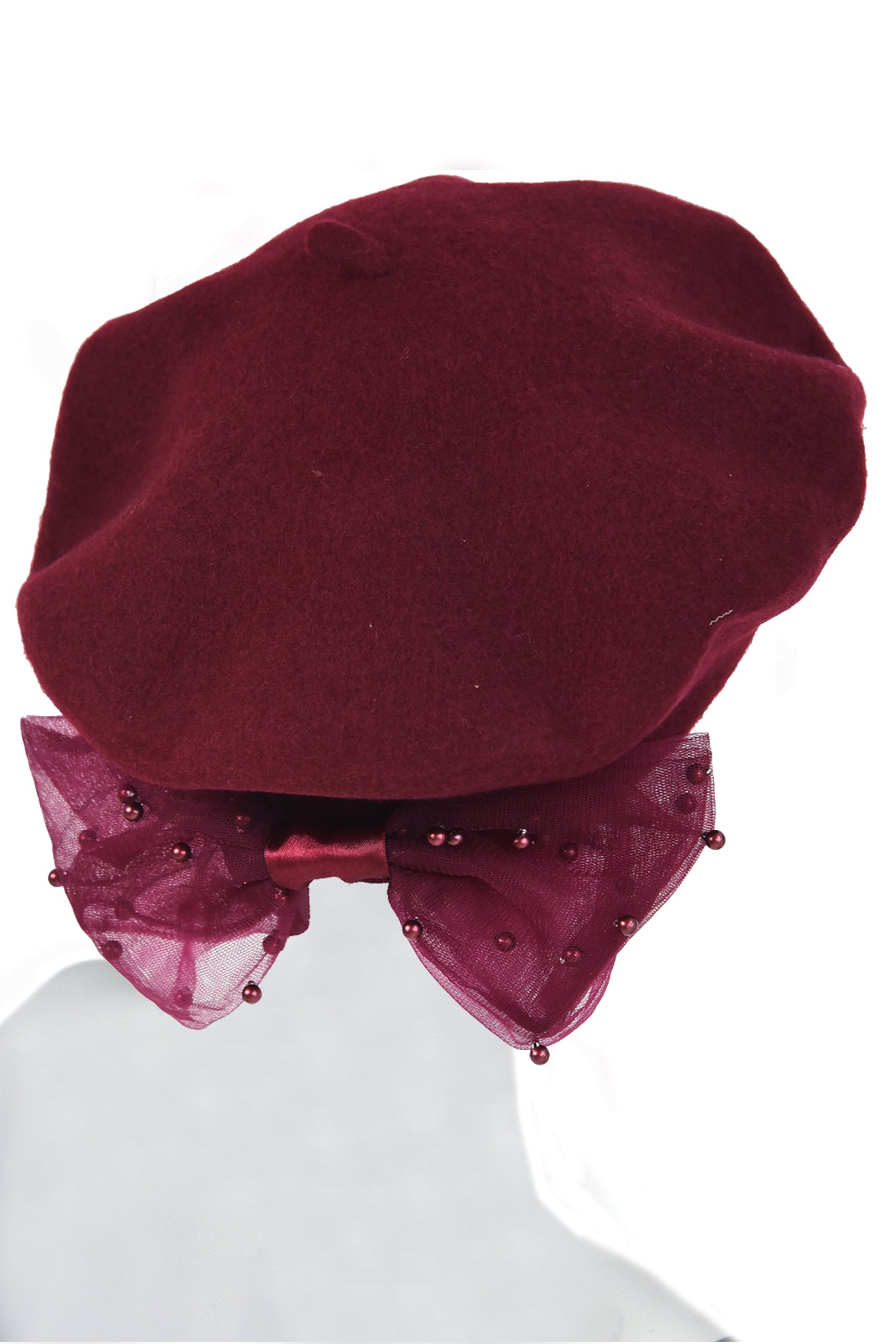 At the back, a handmade tulle bow adorned with delicate pearls and finished with a satin band adds a sophisticated and feminine detail, perfectly complementing the rich, deep red tone.