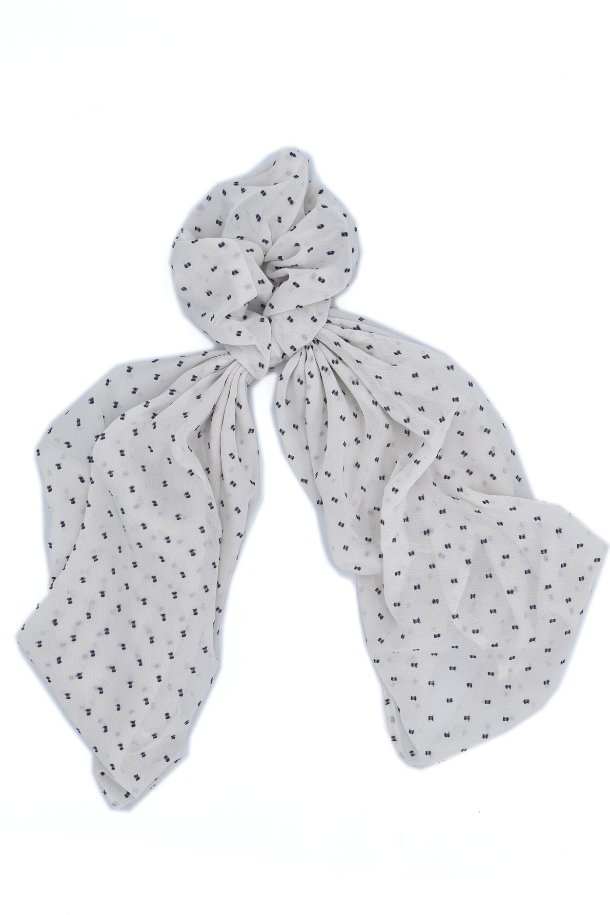 White faux scarf scrunchie with blue embroided squares.